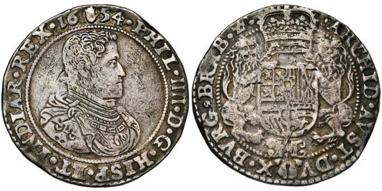 The regular type, issued 1636-65 from Antwerp (with hand mintmark) and Brussels, is scarce but not rare. The multiple ducatons, which include double and quadruple issues, are all rare. Triple ducatons of this portrait were struck intermittently 1637-57. The other provinces issued this type, including Artois, Flanders, Tournai and Luxembourg.