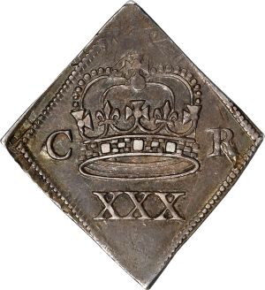 "The Single Finest Certified of this Classic Newark Besieged Issue by PCGS, GREAT BRITAIN. First Civil War. Newark Besieged. 1/2 Crown, 1646. Charles I. PCGS AU-53. Siege: 26 November 1645 - 8 May 1646. Irregular lozenge flan with a jeweled crown flanked by C-R, denomination below XXX; Reverse: Inscription in three lines; Legend: OBS:/NEWARK/1646. This charming and very attractive survivor exhibits boldly struck central designs with signs of wear primarily on the high points displaying lovely rich old cabinet patina with an iridescent sheen. This wholly original looking example is pleasing to the eye and is vastly superior than normally encountered.