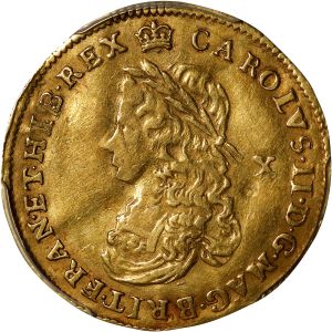 This specimen was lot 51039 in Stack's Bowers ANA sale (Pittsburgh, PA, August 2023), where it sold for $6,000. The catalog description[1] noted, "Wholesome Double Crown from the Beginning of the Stuarts' Restoration. GREAT BRITAIN. Double Crown, ND (1660-62). London Mint; mm: Crown/-. Charles II. PCGS EF-45. Obverse: Laureate, draped, and cuirassed bust left; X (mark of value) to right; Reverse: Crowned and garnished coat-of-arms. Clearly spending some time in commerce, this VERY RARE issue nevertheless remains without issue and with fairly clear features displayed throughout. An excellent opportunity for the collector seeking a solid representative of an emission that does not often present itself in the market." Oliver Cromwell's death in September 1658 left a leadership vacuum which was quickly filled by inviting prince Charles back from exile to become Charles II. The first series of gold coins of his regime reverted to the old practice of not dating them and come in denominations of unite (Fr-275), double crown (shown here) and crown (Fr-279). When milled coinage was introduced in 1663, these denominations were retired in favor of the guinea, its fractions and multiples. The guinea would be the basis for all gold issues until the reform of 1817 and took its name from the source of the original gold, the Gulf of Guinea in west Africa.