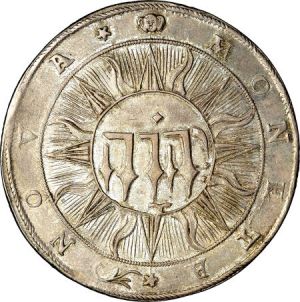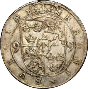This specimen was lot 30261 in Heritage sale 3029 (New York, January 2014), where it sold for $35,250. The catalog description[1] noted, "Rare and Attractive Carl (IX) Regency Period Daler 1599, Stockholm mint, MS63 NGC. Struck during the turbulent political times in Sweden when Carl was representing the Vasa ruling family in Stockholm while his brother, Sigismund, was King in Poland. Discord between the Protestants and Catholics weakened the State and eventually broke out as the Thirty Years War. In 1600 Sigismund was forced to abdicate the throne in Sweden and Carl IX became King. This example of the rare Daler struck during the Regency is sharply detailed and most attractive with light silver and gray patina. The obverse features the coat of arms of Sweden while the reverse shows Jehovah in Hebrew surrounded by rays of light." Davenport lists this for 1598-99.