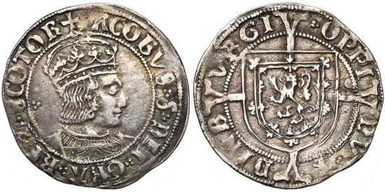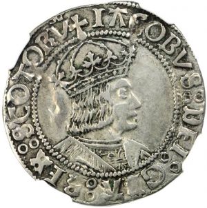 "GRANDE-BRETAGNE, ECOSSE, Jacques V (1513-1542), AR groat, s.d. (1526-1539). 2e monnayage. Type III. D/ B. cour. à d. R/ Ecu arrondi posé sur une croix. Très Beau. (Great Britain, kingdom of Scotland, James V, 1513-42, undated silver groat, second coinage, type III. Obverse: crowned bust right; reverse: round bottomed arms charged on a cross. Very Fine.)"