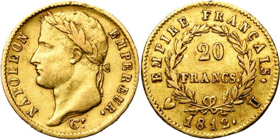 "FRANCE, Napoléon Ier (1804-1814), AV 20 francs, 1812U, Turin. 7.339 p. frappées. Rare. presque Très Beau. (empire of France, Napoleon I, 1804-14, gold twenty francs of 1812, Turin mint. Rare, about very fine.)"