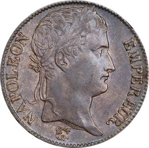 This specimen was lot 34127 in Stack's Bowers NYINC sale (New York, January 2025), where it sold for $840. The catalog description[1] noted, "FRANCE. Empire. 5 Francs, 1814-Q. Perpignan Mint. Napoleon I. PCGS AU-58. Surpassed in the PCGS population report by just one other example, this exceptionally attractive and inviting example provides a delightful tone that is comprised of gunmetal gray and pale blue hues. From the Richard Margolis Collection (acquired from Lepczyk in 1984 for $40). Ex: George Sobin Collection (Joseph Lepczyk - 3/1984) Lot # 1348." Shown is a Napoleonic five francs struck at the Perpignan mint in 1809-14. The various designs of Napoleonic five francs form eight distinct types of which this is the seventh, struck 1809-14 with a complete set of this type comprising 86 date and mintmark combinations, some very rare. This date is somewhat scarce for the type, being priced 2½ times the common date (1811-A). It was officially withdrawn from circulation in 1928 and demonetized in 2005 but ceased to circulate after World War One.