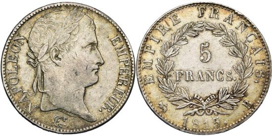 "FRANCE, Napoléon Ier, période des Cent-Jours (1815), AR 5 francs, 1815B, Rouen. Rare Petits coups. Très Beau. (France, first empire, Napoleon I, Hundred Days (1815), silver five francs, Rouen mint. Rare, minor nicks, Very Fine.)"