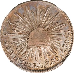 This specimen was lot 70434 in Stack's Bowers Collector's Choice sale (Costa Mesa, CA, May 2023), where it sold for $240. The catalog description[1] noted, "MEXICO. 8 Reales, 1855-Do CP. Durango Mint. NGC AU Details--Cleaned. Variety with eagle type of 1854. This decently preserved example exhibits bold devices with even wear and attractive mottled patina. Close inspection reveals evidence of a past cleaning, now subdued and attractive. Despite its shortcomings, a wholesome example of the type with a pleasing appearance." The Durango mint was opened in 1812 to strike portrait eight reales during the War of Independence. It was one of three mints to strike "hookneck eagle" eight reales in 1824. The standard eagle was adopted in 1825. Durango struck all the gold and silver denominations except the four reales and the four escudos. For this year, the SCWC reports two eagle styles, the "eagle of 1854" and "eagle of 1856". The eagle of 1856 looks like the standard eagle used at Mexico City and other mints. The eagle of 1854 superficially looks the same but has an odd feather pattern on the wings. This date is somewhat scarce. Assayer CP is listed for 1852-73. Dies at Durango were made using distinctive hubs using an elegant eagle (often called the "French eagle") but left in service far longer than at other mints, creating a multitude of varieties, including many overdates. The Durango mint closed in 1895, along with Guadalajara, Chihuahua, Alamos and Hermosillo.
