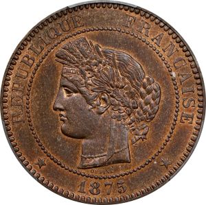 This specimen was lot 74856 in Stack's Bowers Collectors Choice Online Auction (Costa Mesa, CA, February 2025), where it sold for $384. The catalog description[1] noted, "FRANCE. 10 Centimes, 1875-A. Paris Mint. PCGS MS-64 Red Brown." The specimen shown is a ten centimes, Cérès head, of a type struck under the Third Republic of France 1870-98. The majority, including this one, are Paris mint issues but Bordeaux produced this type 1871-78. There are 45 dates in the series, some expensive but only the 1897-A with the fasces privy mark is rare. The 1875-A is a very scarce date. The total production for the series is about fifty million, compared to 258 million Napoleon III "bare head" 10 centimes (1852-57) and 52 million "laureate head" 10 centimes (1861-65). The Cérès head was replaced by the "Marianne" head by Daniel-Dupuis (struck 1898-1921). All the bronze ten centimes pieces were demonetized in 1935.