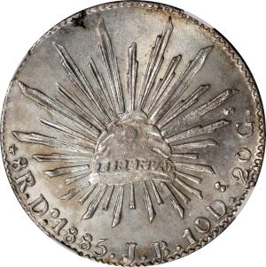 This specimen was lot 7773 in Stack's Bowers NYINC sale (New York, January 2022), where it sold for $504. The catalog description[1] noted, "MEXICO. 8 Reales, 1885-Do JB. Durango Mint. NGC MS-63. This example exhibits sharp strike detail throughout, pleasing full luster, and various toning colors." The Durango mint struck eight reales 1824-95. Assayer JB, shown here, is awarded a premium over assayer MC for 1885.