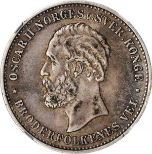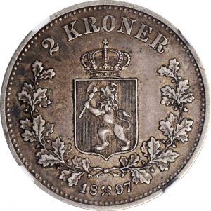 This specimen was lot 73345 in Stack's Bowers Collector's Choice sale (Santa Ana, CA, June 2020), where it sold for $288. The catalog description[1] noted, "NORWAY. 2 Kroner, 1897. Kongsberg Mint. Oscar II. NGC EF-45. A better date in the series, this piece does exhibit some moderate wear, but the surfaces are entirely problem free and handsomely toned." In 1907, Norway obtained a divorce from Sweden and became an independent kingdom under a Danish prince. Even before passing under Swedish rule in 1814, Norway had enjoyed a separate coinage from Denmark. The specimen shown here is from of a type struck 1877-1904 and was accompanied by a silver fifty øre and one krone of similar design. Many dates are very scarce.
