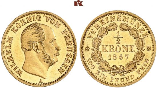 "BRANDENBURG-PREUSSEN, PREUSSEN, KÖNIGREICH, Wilhelm I. 1861-1888. 1/2 Vereinskrone 1867, A. GOLD. Seltener Jahrgang. Prachtexemplar. Fast Stempelglanz. Erworben 1954 bei der Firma Grabow, Berlin. (Germany, kingdom of Prussia, William I, 1861-88, half union crown of 1867. Rare date, choice example, about uncirculated. Bought from Grabow in 1954.)"