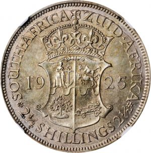 This specimen was lot 46058 in Stack's Bowers ANA sale (Costa Mesa, CA, August 2021), where it sold for $360. The catalog description[1] noted, "SOUTH AFRICA. 2-1/2 Shillings, 1925. NGC Unc Details--Cleaned. A sharply struck coin with gray to almond color and a few old hairlines in the obverse fields, now obscured by the toning." The 2½ shillings or half crown was struck in South Africa 1923-60. It was 0.800 fine silver until 1930 and 0.500 fine thereafter. The later issue (KM 19.2) varies from this type by having "2½ SHILLINGS" in the reverse legend.