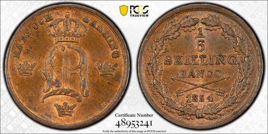 This specimen was lot 1231 in Stephen Album internet sale 28 (Santa Rosa, CA, July 2024), where it sold for $144. The catalog description[1] noted, "SWEDEN: Oscar I, 1844-1859, AE 1/6 skilling banco, 1854, a wonderful lustrous example! PCGS graded MS64 RB." By the reform of 1830, 32 skilling banco = one riksdaler. This type was struck 1844-55 and is common. It is the last of the denomination. This is a common date.
