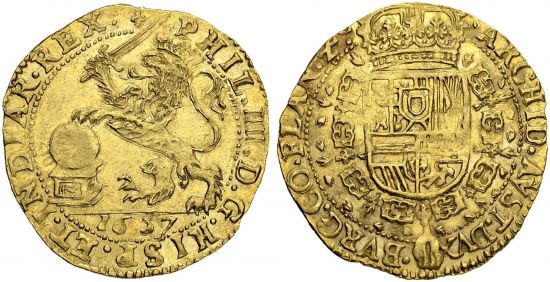 "BELGIUM | Brabant, Herzogtum, Philipp IV. 1621-1665 Souverain dor 1657. Brüssel. Selten in dieser Erhaltung. Gutes vorzüglich. (duchy of Brabant, Philip IV, 1621-65, souverain d'or of 1657, Brussels mint. Rare in this condition, Good extremely fine.)"
