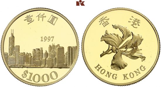 "HONG KONG, Elizabeth II, 1952-1997. 1.000 Dollars 1997, auf die Rückgabe Hong Kongs an China. Stadtansicht von Hong Kong. 14,65 g Feingold. GOLD. NGC mit der Bewertung PF 69 ULTRA CAMEO, Polierte Platte. (Hong Kong, Elizabeth II, 1952-97, one thousand dollars of 1977, on the return of Hong Kong to China. Obverse: city view. NGC PF-69 ULTRA CAMEO, proof.)"