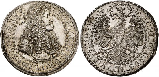 "RÖMISCH-DEUTSCHES REICH, Leopold I. 1657-1705. Doppelter Reichstaler o. J. Hall. Feine Patina, winz. Zainende, fast vorzüglich. (Holy Roman Empire, Leopold I, 1657-1705, undated double thaler, Hall mint. Fine patina, slightly clipped, about extremely fine.)"