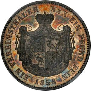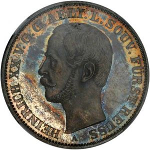 This specimen was lot 40543 in Ponterio sale 168 (Philadelphia, August 2012), where it sold for $1,552. The catalog description[1] noted, "GERMANY. Reuss-Obergreiz. Taler, 1858-A. NGC MS-66. One year type. Toned with lustrous highlights." Reuss was one of the splinter states of Saxon Thuringia and itself underwent several divisions. Many rulers were named Heinrich and several lines consolidated their numbering, resulting in this prince becoming Heinrich the twentieth. Reuss-Schleiz was the only line to survive into the unified empire. This type is fairly common.