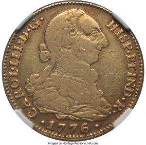 This specimen was lot 33819 in Heritage sale 3064 (Chicago, April 2018), where it sold for $1,200. The catalog description[1] noted, "Charles III gold 4 Escudos 1776 S-CF VF30 NGC, Seville mint. Dark toning around the peripheries provides a pleasing frame for the central features. The reverse exhibits a bold strike." This type was struck in Madrid 1772-85 (KM 418.1) and Seville 1772-85 (KM 418.2). The Spanish four escudos of Charles III are more available than eight escudos of the same period. It is distinguished by later issues of Charles III (1785-88) by being 0.901 fine instead of .875 fine gold. Four escudos prior to this type are all rare.