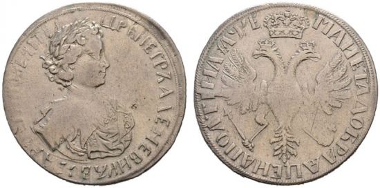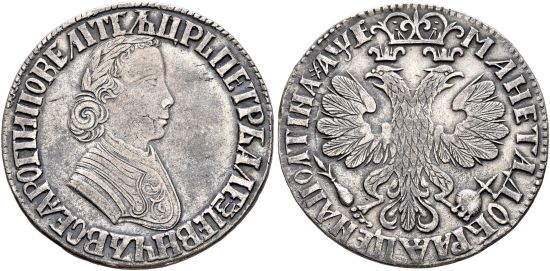 The first specimen was lot 19 in Sincona sale 19 (Zurich, October 2014), where it sold for CHF 13,000 (about US$16,291 including buyer's fees). The catalog description[1] noted, "Poltina 1705, Kadashevsky Mint. “Highly decorative in high relief”! Extremely rare!! 50 roubles according to Petrov! 25 roubles according to Trapeznikov. Plugged and repaired. Slightly cleaned. Very fine. Collector’s note: 'RR. Auction B.Ahlström Stockholm in approx. in (19)74. Bought through Hirsch. Petrov page 22 #838 var' Ex famous auction Adolph Cahn, no. 66, 6th of May 1930, lot 1000." The second specimen was lot 20 in Sincona sale 78 (Zurich, October 2022), where it sold for 2,000 CHF (about US$2,397 including buyer's fees). The catalog description[2] noted, "RUSSIA | Russian Empire and Federation | Peter I. 1682-1725, Poltina 1705, Kadashevsky Mint. 5 roubles according to Petrov. Attractive very fine." This half ruble of 1701-05 is rare, like most of the silver minors of Peter I. This specimen realized ten times the catalog value despite being plugged.