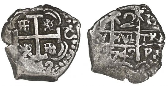 This specimen was lot 537 in Sedwick Treasure Auction 26 (Winter Park, FL, November 2019), where it sold for $333.20. The catalog description[1] noted, "Potosí, Bolivia, cob 2 reales, 1742C/P. Very deeply toned VF, choice full cross with very clear C/P to right (scarce), date below, second date and C/P visible on pillars side." The Spanish colony of Upper Peru produced hammered cob coinage at the Potosí mint from 1573 to 1773, with a major debasement scandal and subsequent reform occurring in 1649-1652. The period 1767-1770 saw the simultaneous issue of milled columnarios. The royal or presentation issues are very rare and highly sought after, while the regular strikes vary in price according to the visibility of the date, mint, and assayer initials.