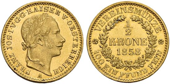 "HEILIGES ROMISCH REICH, Franz Joseph I. 1848-1916. 1/2 Vereinskrone 1858 A, Wien. Vorzüglich-FDC. Prachtexemplar. (Austria, Francis Joseph I, 1848-1916, half union crown of 1858, Vienna mint. Extremely fine-uncirculated, Cabinet piece.)"