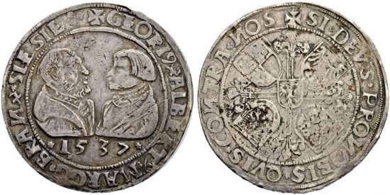 "GERMANY, Brandenburg-Franken, Markgrafschaft, Georg und Albrecht, 1527-1545. Taler 1537, Schwabach. Sehr schön. Schöne Portraits. (margraviate of Brandenburg-Franconia, George and Albrecht, 1527-45, thaler of 1537, Schwabach mint. Very fine, Nice portraits.)"