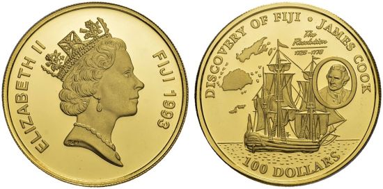 "Fiji, Republik, seit 1970 100 Dollars 1993. Auf die Entdeckung durch James Cook. Polierte Platte. FDC. (republic of Fiji, since 1970, one hundred dollars of 1993, on the islands' discovery by James Cook. Choice Proof.)"
