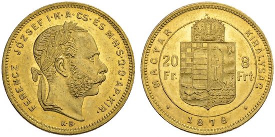"HOLY ROMAN EMPIRE - AUSTRIA, Franz Joseph I. 1848-1916 8 Forint-20 Francs 1878. Kremnitz. Vorzüglich-FDC. ((Kingdom of Hungary, Francis Joseph I, 1848-1916, eight florins or twenty francs of 1878, Kremnitz mint. Extremely fine-uncirculated.)"