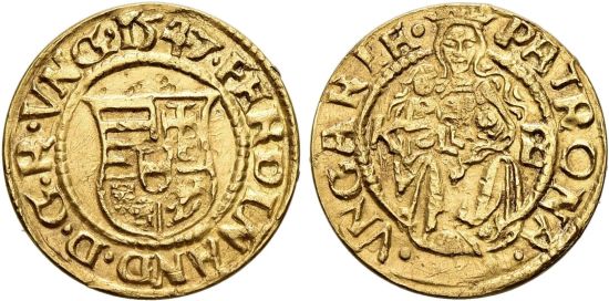 "RDR / ÖSTERREICH, Ferdinand I. 1521-1564. 1/2 Dukat 1547 KB, Kremnitz. Goldabschlag von Denar. Sehr selten. Fast vorzüglich. (Holy Roman Empire, Ferdinand I, 1521-64, half ducat of 1547, Kremnitz mint, struck using denar dies. Very rare, About Extremely Fine.)"