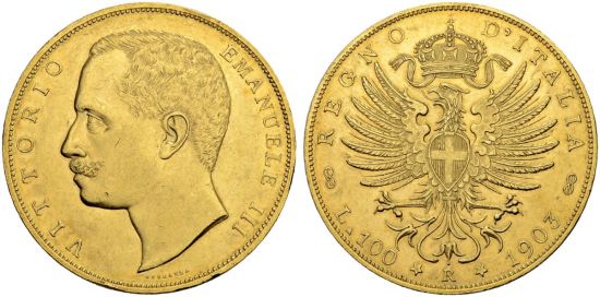"ITALY, Königreich, Vittorio Emanuele III. 1900-1946. 100 Lire 1903 R, Rom. Sehr selten. Vorzüglich. Kleiner Randfehler. (kingdom of Italy, Victor Emanuel III, 1900-46, hundred lire of 1903, Rome mint. Very rare, Extremely fine, Minor edge nick.)"