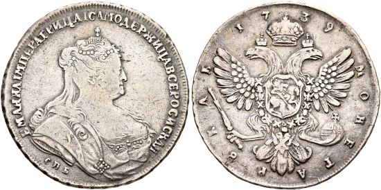 This specimen was lot 3012 in Sincona sale 77 (Zürich, May 2022), where it sold for 350 CHF (about US$425 including buyer's fees). The catalog description[1] noted, "RUSSIA | Russian Empire and Federation | Anna, 1730-1740. Rouble 1739, St. Petersburg Mint, SPB, 3 roubles according to Petrov. About very fine." The coinage of Russia of the eighteenth century is a confusing and fascinating subject. Many ruble types were issued only briefly and can be dated even if they don't bear dates. This type was issued from St. Petersburg (shown here) and Moscow (KM 203/Dav-1674) and is rare. It was issued 1736-40 and is priced quite a bit lower than previous issues of Peter I, Catherine I and Peter II. It varies from the similar Moscow issue by the addition of a mintmark and slightly different hairstyle on the empress. The massive portrait of the empress can only have been drawn from life. The rubles of Peter II were about 28 grams but this type seems to be only 25.85 grams.