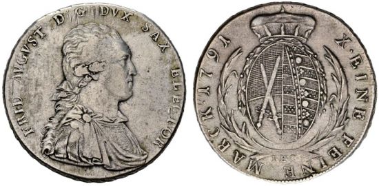 "Konventionstaler 1791. Dresden. Sehr schön-gutes sehr schön. (Electorate of Saxony, convention thaler of 1791, very fine.)"