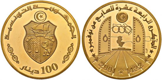 This specimen was lot 364 in Sincona sale 31 (Zürich, October 2016), where it sold for 2,000 CHF (about US$2,374 including buyer's fees). The catalog description[1] noted, "REPUBLIC OF TUNISIA, 100 dinars 2001ce/1422ah AU RRR Pf." This type, struck with French and Arabic legends (shown here), honored the fourteenth anniversary of the revolution which overthrew the senile Habib Bourgiba in 1987 and the 19th Mediterranean Games. It was accompanied by a gold fifty dinars (KM 431) and a silver ten dinars (KM 378). It is unlikely to have circulated beyond the president's circle of cronies and supporters. Zine Ben Ali, Bourgiba's successor, was himself overthrown in 2011.