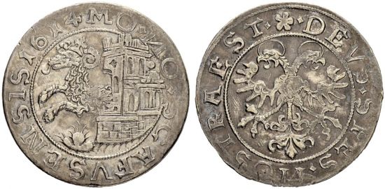 The SCWC does not price this type of 1611-21 in any grade higher than Very Fine. The dicken traded for 24 kreuzer. The city arms depict an ibex leaping, sometimes by itself or out of a castle window (as here).
