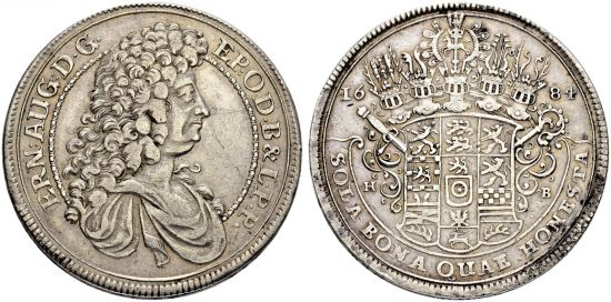 "Braunschweig-Lüneburg-Calenberg-Hannover, Herzogtum, Ernst August, 1679-1698. Taler 1684, Clausthal. Ausbeute der Grube Ernst August. Mit Randschrift: ERNESTI AUGUSTI DUCIS HÆC SCROBS PRÆMIA REDDIT. Äusserst selten. Gutes sehr schön. Kleine Randfehler. (Germany, duchy of Brunswick-Luneburg-Calenberg-Hannover, Ernest August, 1679-98, thaler of 1684, Clausthal mint, for the Ernst August mine, with edge lettering. Extremely rare, Good very fine, Minor edge nicks.)"