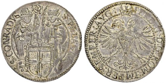 "GERMANY, Konstanz, Stadt, Halbtaler o. J. (um 1622). Die beiden Heiligen, Konrad und Pelagius, stehen nebeneinander; vor sich das Stadtwappen. Rv. Gekrönter, nimbierter Doppeladler. Äusserst seltene Erhaltung. Fast FDC. (Germany, city of Constance, undated half thaler. Obverse: SS. Conrad and Pelagius stand together, city arms below; reverse: crowned, nimbate double headed eagle. Extremely rare condition, About uncirculated.)"