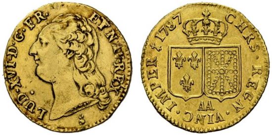 "Louis d`or au buste nu 1787. Metz Sehr schön-gutes sehr schön. (kingdom of France, Louis XVI, louis d'or of the bar bust of 1787, Metz mint, very fine.)"