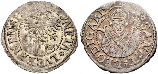 "SWITZERLAND | Lucerne | Stadt und Kanton. Schilling 1600, Luzern. Mindere Jahreszahl 6 - 00 seitlich des kleinen Luzernerwappens. Sehr schön-vorzüglich. Flaue Stellen. (Switzerland, canton of Luzern, schilling of 1600, Luzern mint, with the Luzern arms dividing the date. Very fine-extremely fine, Some weakly struck areas.)"
