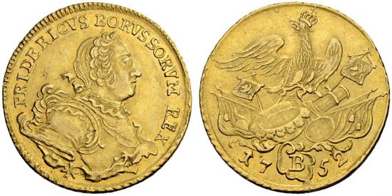 Altho Frederick began his reign by minting ducats, in 1741 he switched to friedrichs d'or, a renamed version of the wilhelm d'or minted by his father. The early issues are rare but the coin later came to be quite common and was imitated by other North German states as a five thaler gold coin. This type was struck 1750-57 and 1764 at Breslau.