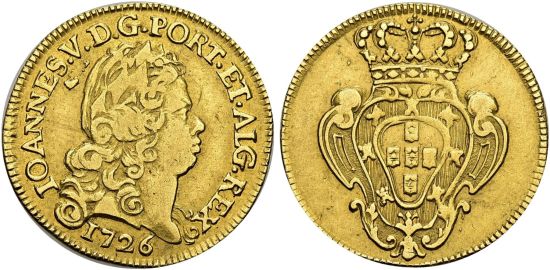 "PORTUGAL Königreich, João V. 1706-1750. Escudo 1726, Lissabon. Sehr schön. (kingdom of Portugal, John V, 1706-50, escudo of 1726, Lisbon mint. Very fine.)"