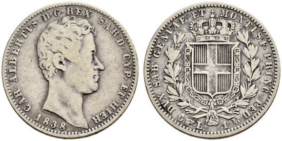 "ITALIA | Sardinia - House of Savoy. Carlo Alberto, 1831-1849 Lira 1838. Torino. Molto rara. MB/BB. (kingdom of Sardinia, Charles Albert, 1831-49, lira of 1838, Turin mint. Very rare, fine to very fine.)"