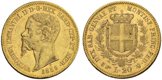This type was struck at the Turin and Genoa mints 1850-61 during the reign of Victorio Emanuele II of Italy, while he was merely King of Sardinia (1849-61). It is struck to the same standard as the contemporary French twenty francs. It is, however, reasonably common.
