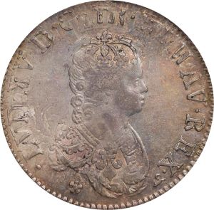 The second specimen was lot 45857 in Stack's Bowers ANA sale (Chicago, August 2024), where it sold for $630. The catalog description[3] noted, "FRANCE. Ecu, 1716-B. Rouen Mint. Louis XV. PCGS EF-45." This is an écu vertugadin of the Rouen mint, struck while Louis XV was a minor. Droulers[2] notes the 1716-B as common as "flan reformé" (struck over an earlier type) while "flans neufs" are accorded a 20% premium. The specimen shown is a "flan reformé;" the undertype can be see at the top of the king's head. The type was struck 1715-18 in substantial numbers but was replaced by the écu de France-Navarre, which is only 24.47 grams. At the time of issue, it had a face value of 5 livres tournois, which rose to 15 livres in July 1720 but was demonetized in September 1720 at a value of 13 livres, 2 sols, 6 deniers.