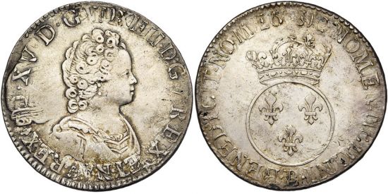 "1163. FRANCE, Royaume, Louis XV (1715-1774), AR écu Vertugadin, 1716B, Rouen. Réformation. D/ B. enfantin à d., dr. et cuir. R/ Ecu de France rond, couronné. Très Beau. (kingdom of France, Louis XV, 1715-74, silver écu vertugadin of 1716, Rouen mint, reformed. Obverse: draped and armored infant bust to right; reverse: crowned round arms of France. Very Fine.)"
