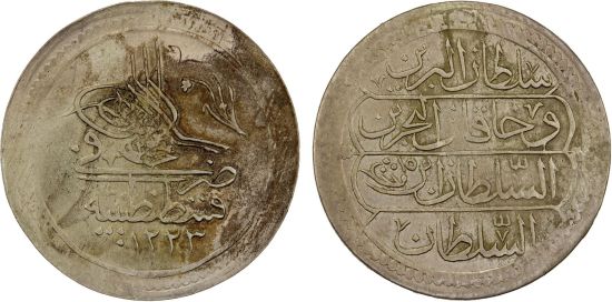 This specimen was lot 1826 in Steve Album Auction 52 (Santa Rosa, CA, May 2025), where it sold for $96. The catalog description[1] noted, "TURKEY: Mahmud II, 1808-1839, BI kurush, AH1223 year 15, somewhat weak margins, uneven tone, two-year type, Choice XF, ex Ralph A. Cannito (with tag)." This kuruş was part of the fourth issue of silver during this reign. These coins are dated years 14-15. The coinage was suffering violent gyrations in value and the kurush was issued in the fourth, fifth and seventh issues only. The reform of the next reign would stabilize the coinage until the collapse of the Ottomans at the end of World War One.
