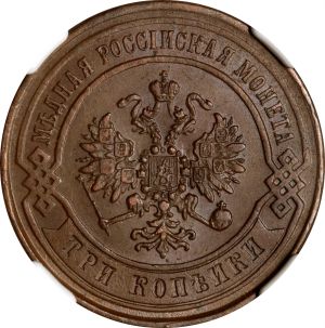 This specimen was lot 75296 in Stack's Bowers Collector's Choice sale (Costa Mesa, CA, February 2022), where it sold for $456. The catalog description[1] noted, "RUSSIA. 3 Kopeks, 1868-EM. Ekaterinburg Mint. Alexander II. NGC MS-62 Brown. Well impressed and charming, this minor is sure to turn some heads with the desirous chocolate brown color." This type was struck 1867-76 and is one of the last issues of the Ekaterinburg mint. The denomination was reduced in weight to 9.83 g in 1867 and struck in that form until the end of the regime.