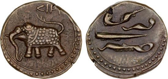 The first specimen was lot 2677 in Steve Album Auction 51 (Santa Rosa, CA, January 2025), where it sold for $288. The catalog description[1] noted, "MYSORE: Tipu Sultan, 1782-1799, AE paisa, Farrukhi, AM1217, elephant left, slight porosity on the obverse only, XF." The second specimen was lot 2337 in Steve Album Auction 52 (Santa Rosa, CA, May 2025), where it sold for $288. The catalog description[2] noted, "MYSORE: Tipu Sultan, 1782-1799, AE paisa, Farrukhi, AM1217, elephant left, date above, superb strike, XF." This type was struck years AM 1216-1219 and is common. One rupee was 64 paisa. The Mauludi Era (AM) was a calendar invented and used only by Tipu Sultan and it lapsed after his death in battle in 1799. Many mints issued these copper paisa in dozens of styles.