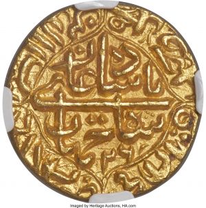 This specimen was lot 30928 in Heritage sale 3081 (New York, January 2020), where it sold for $2,400. The catalog description[1] noted, "India: Mughal Empire. Shah Jahan gold Mohur AH 1062 Year 26 (1651/2) MS65 NGC, Akbarabad mint. A magnificent and nearly unparalleled example of this king's beloved gold coinage, executed in a characteristic high relief with hardly a stray mark and satiny recessed fields. Ex. CNG Auction 93 (22 May 2013, Lot 1586) (Sold with old lot tag)." This type was struck years 6-28 at Akbarabad and Daulatabad. The Mughal Empire dominated India during the seventeenth century but broke up in the eighteenth century under external attack, Hindu rebellion and civil war. This collapse allowed European colonizers entry into the subcontinent and eventual British control. The emperor Shah Jahan is today remembered for erecting the Taj Mahal for his wife.