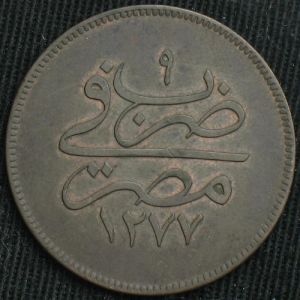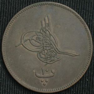 The coin shown is a copper ten para, from the reign of Sultan Abdul Aziz. It was struck at the Cairo Mint. The obverse bears the toughra, or signature, of the sultan, with the denomination written below (abbreviated as the letter P for para) with the number 10. The reverse carries the ascension date and the text minted in Misr (Misr is Arabic for Egypt). The date is written as AH 1277 year 9, which translates to about 1868 AD. Uslu[1] lists this issue as scarce.