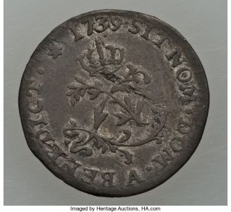 This coin, called a sol aux 2 L couronnés, was an attempt by the government of France to displace all the low grade silver pieces circulating since the time of Louis XIII. It was theoretically equal to 12 deniers but was actually worth much less. Most survivors today are in poor condition. The type was struck 1739-48 with nearly all the production occurring on 1740. Droulers[1] estimates the total production of this type to be around 2.3 million, compared to 81 million for the double sol. This specimen was part of lot 29011 in Heritage sale 3064 (Chicago, April 2018), which sold for $1,200. The catalog description[2] noted, "Quartet of Louis XV Sols (1/2 Sous Marqués), 1) 1739-A VF, Paris mint. Second semester and the only date-mint combination of this type known as such. Dark gray with yellow traces at the periphery. A couple of small surface flaws. Rare. Ex. John Ford. ...A couple of scratches and a small verdigris spot on the rev. From the Doug Robins Collection of Canadian Tokens."