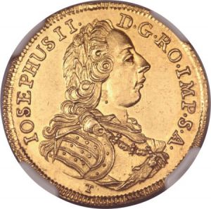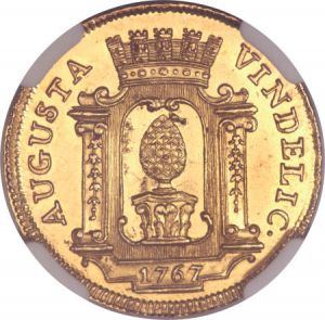 This specimen was lot 23958 in Heritage sale 3024 (Chicago, April 2013), where it sold for $3,642.50. The catalog description[1] noted, "Augsburg. Josef II gold Ducat 1767-T, MS64 NGC, an uncommonly attractive piece with reflective fields; the die flaw on the reverse above the pine cone is present on almost every known example of this type." The city of Augsburg only issued ducats on special occasions and are consequently they are quite scarce. This is the last ducat from this locale, which was annexed by Bavaria in the Napoleonic consolidations.