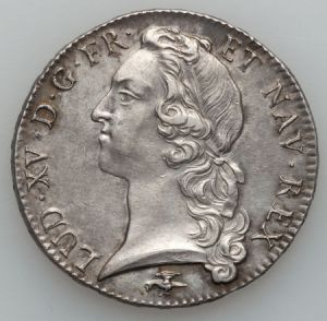 This specimen was lot 26935 in Heritage sale 3026 (Long Beach, October 2013), where it sold for $305.50. The catalog description[1] noted, "Louis XV Ecu 1756-D, Choice AU Details - Cleaned. Lyon Mint. A well-made example with no apparent pre-strike flaws and strong device definition." This specimen is an écu au bandeau of Louis XV of France struck in 1756 at the Lyon mint.